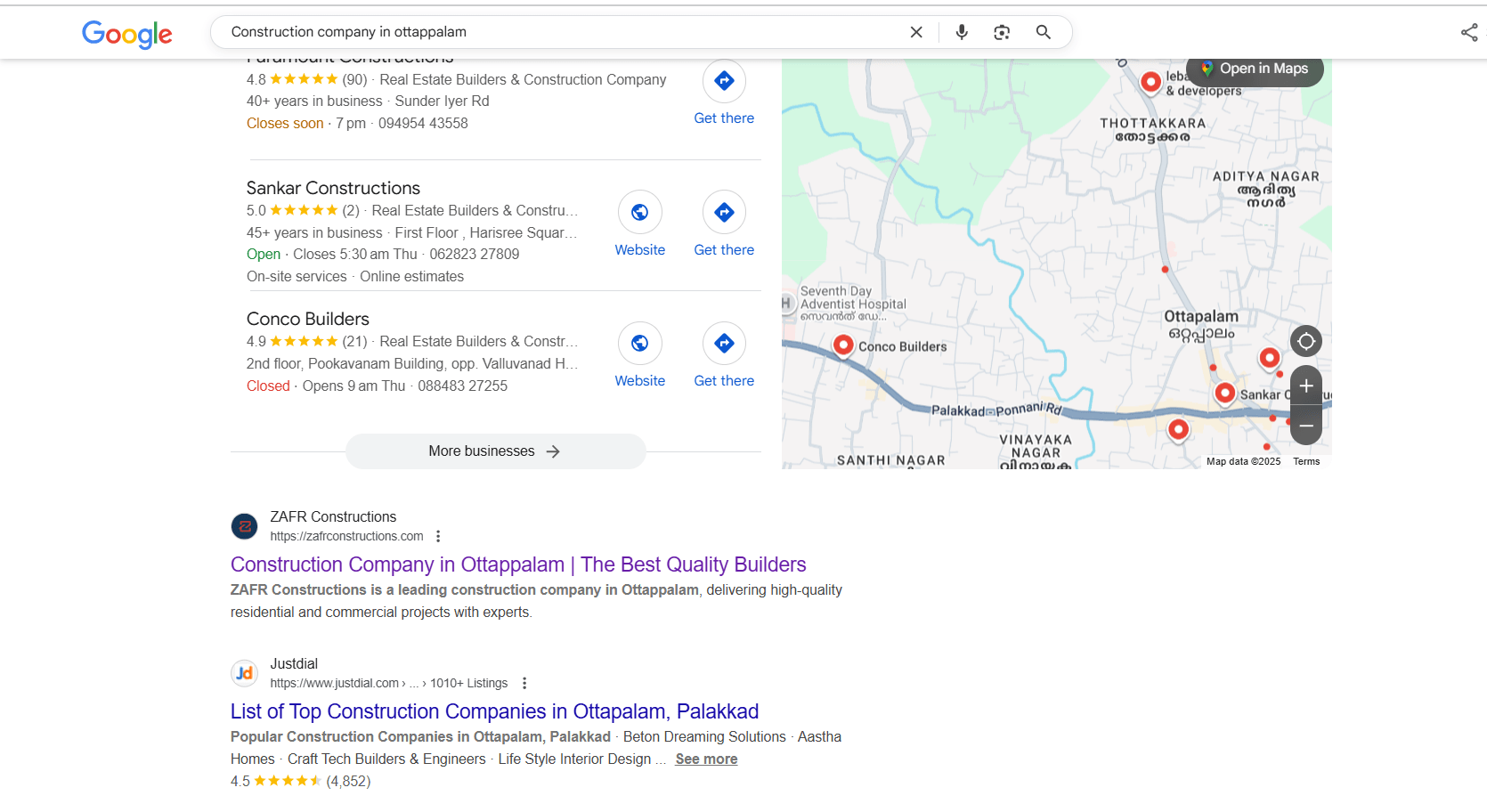 I handled the SEO for zafrconstructions.com with the focus keyword “construction company in Ottappalam.” My strategy included keyword optimization, on-page SEO, technical improvements, and local SEO targeting. This helped the website achieve better visibility in search results, positioning ZAFR Constructions as a trusted local brand and driving more inquiries from clients in and around Ottappalam.